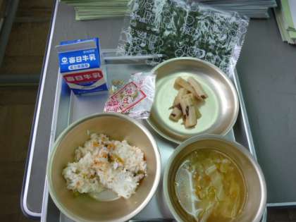 今日は節分献立でした。ご飯には手巻きずしの具を混ぜて、海苔に巻いていただきます。写真は、もうご飯に混ぜた状態です。春の始まりの日を立春といい、その前日が節分です。豆をまいたり、イワシの頭を柊の枝にさして玄関に立てたりして「おに」を追いだす習わしがあります。「鬼は外!福は内!」給食委員会は、給食週間なので「給食クイズ」を昼の放送でしてくれていました。