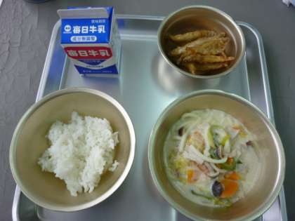 今日、2月17日の給食は豆乳鍋でした。豆乳と白みそと信州味噌で作られただし汁に生うどんや豚肉、白菜や白ネギが入っていました。体がホカホカしました。ワカサギのこはくあげもおいしかったです。