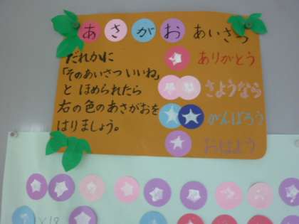 廊下の掲示物に挨拶をがんばっている様子を見つけました。「おはようございます。」「行ってきます。」「行ってらっしゃい!気を付けて。」こんな挨拶を朝、家でかわしていることでしょう。正門では声をかけながら一人一人の今日の元気さ、笑顔を見ています。家でも学校でも、もちろん地域の方々にもどんどん心のこもった挨拶ができるようになってほしいと思っています。
