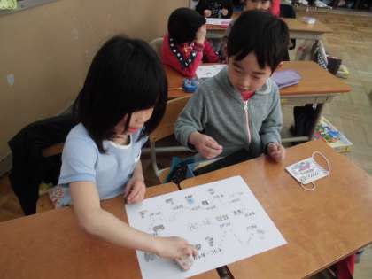 学校すごろくをすることを通して,みんなで合わせたことや楽しかったことをたくさん思い出しました。学習のふり返りでは,「1年間でたくさんのことが経験できた。」「これからも楽しく学校生活を送りたい。」など,たくさん感想を言っていました。
