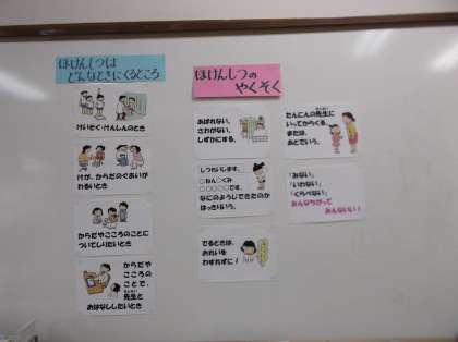 保健室は,紫明校のみんなが利用します。みんなが気持ちよく過ごせて,みんなに必要なお手伝いがすぐにできる保健室になるよう,みんながほけんしつのやくそくを守って上手に利用してくれることを願っています。