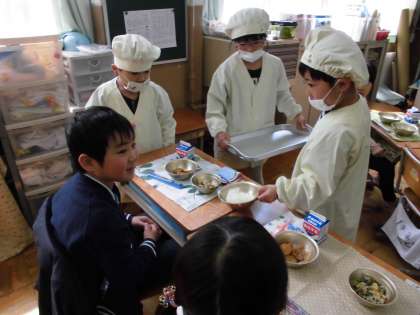 今日は,給食の二日目。りんごグループの人たちが配膳を一生懸命しています。
