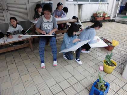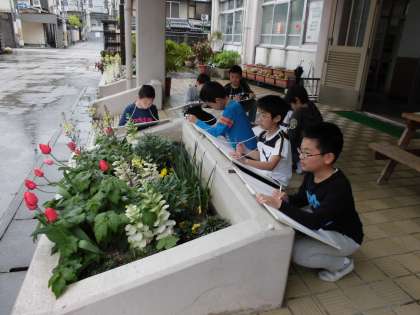 紫明小学校の花壇は、きれいな花がいっぱいです。たくさんの色の花に囲まれ,たくさんの種類の花に囲まれて毎日を過ごしています。図工「じっと見つめて」の学習で、紫明小学校の花をじっと見つめて,絵に表すことにしました。