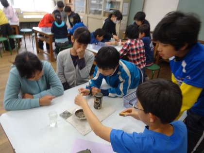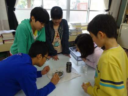 理科の実験でものの燃え方について調べています。熱心に観察しながら調べていました。