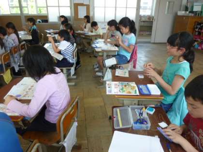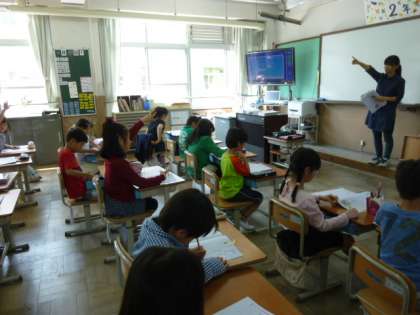 5年の教室では、裁縫「糸と針」に挑戦していました。針に糸を通す!一つ一つの細かい動きに興味津々でした。家でも練習しているでしょうか?1年生はひらがなをていねいに書いていました。文字を知ると言葉にしたくなります。「あ」の付く言葉は・・・あめ、あさがお、ありがとう。どんどん言葉を増やしていけるといいですね。