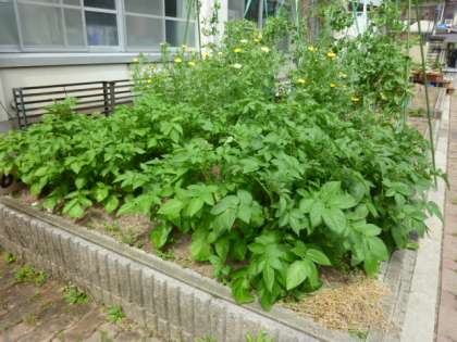 地域の方からいただいたじゃがいもがどんどん育って、大きくなってきました。6年・ひまわり学級・みんな用(校長先生畑?)と3つに分けて育てています。「家で育ててみたい人はいませんか?」とお昼の放送で呼びかけたのが4月。おうちでは、どれくらい大きくなってきているでしょうか?話を聞かせてほしいです。たくさん収穫できることを楽しみに、水やりをしています。