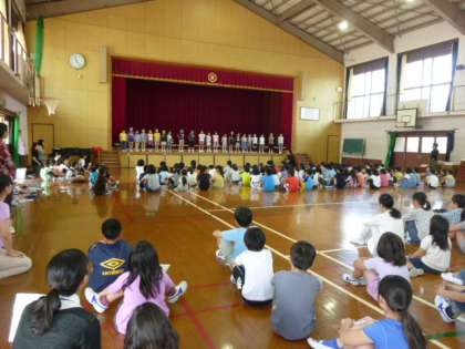 1年生を迎える会が14日にありました。6年生と手をつないで1年生が入場してきました。そして、ステージの上へ。みんなにこにこしています。学校クイズをしたり、貨物列車のゲームをしたり楽しく過ごしました。1年生の自己紹介では、とてもしっかりとした声が、体育館中に響きました。サッカーが好き・縄跳びが好きなどいっぱい話していました。みんなで仲良く楽しい紫明小学校を作っていきましょう。保護者の方々の参観もありがとうございました。