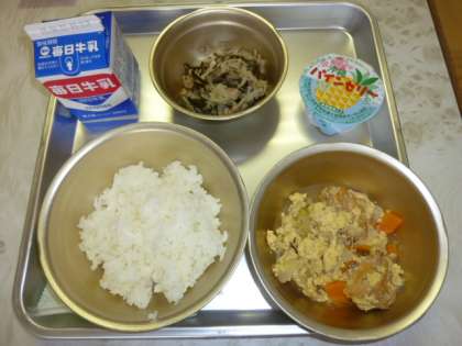 5月25日は、麦ごはん・牛乳・さんまのかわり煮・ほうれんそうのおかかに・若竹汁でした。わかめのカルシウムが、たけのこのえぐみを和らげてくれます。相性の良い食べものどうしを京都では、「であいもん」と言います。おいしい若竹汁でした。26日は、沖縄料理でした。パインゼリーも付きました。