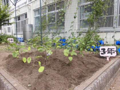 「賀茂なす」と「万願寺とうがらし」を学校の花壇に植えました。