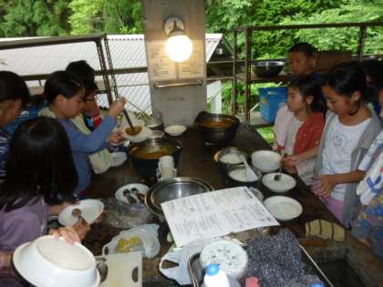 冒険の森が終わってすぐに晩ご飯のカレー作りです。疲れも見せず、みんな頑張りました。かまど係りは、山の家の先生に「杉の葉を使うと着火しやすい。」と教えてもらって一生懸命に集めていました。その通り、上手に火が付きおいしいカレーができあがりました。ご飯も最高においしかったです。後片付けも上手で山の家の先生に「ピカピカに磨けてすばらしい!」とほめていただきました。嬉しかったです。入浴も終わり、これからおうちの方への手紙を書きます。お楽しみに!