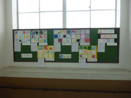 階段の掲示板にいろんな作品が貼ってありました。習字や図工の作品などです。どんな気持ちで、どんな様子で作品を仕上げていたのかなと想像しながら見ていると楽しいです。