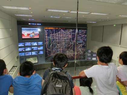 まず,事件を解決するための,警察の素晴らしい連携をドラマで見せていただきました。そのあと,スクリーンと連携したボタンを使って,クイズに挑戦しました。スクリーンの向こうには,交通管制センターがあり,京都市の様々な道の状態が大きな電光地図に表示され,道の状況をたくさんのモニターが映し出していました。