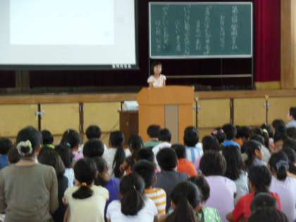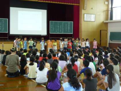 7月16日に紫明タイムを行いました。1年生の担当です。入学して4か月、友達とのいろいろな場面でのかかわりを作文にまとめました。優しくしてもらったから、次はぼくが、する。応援してもらったから鉄棒ができるようになった。だから私も、これからしてもらったように友達にも応援します。というような内容のことを上手にしっかりと発表しました。歌も元気いっぱい歌うことができました。たくさんの保護者の方々にもみていただき、より一層張り切っていました。ありがとうございました。大成功でした。9月は4年生です。