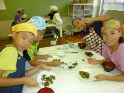 3年生が育ててきた「賀茂ナス」と「万願寺とうがらし」が大きくなりました。ちょうど、7月7日の給食の献立にもあったし新聞にも出ていた「京野菜のごまみそかけ」を作りました。まんまるでかわいいナスを大事に切りました。万願寺とうがらしも丁寧に種を取りました。作り方は、給食調理員さんにくわしいレシピを見せてもらいました。味噌は、八丁味噌と信州味噌を使いました。みんなで育てて、食べて大満足でした。その週末にさっそくおうちでも作ったよ!と話してくれる子どもたちがいました。嬉しいことです。京野菜・紫明野菜?でした。これからもいろんなものに挑戦していきます。
