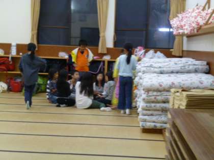 2日目の夕食のカレー作りを終えて、お風呂に入って、ほっとひと息の子どもたちです。バスタオルや水着いっぱい干しています。このあとは、ナイトハイクです。