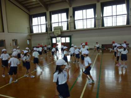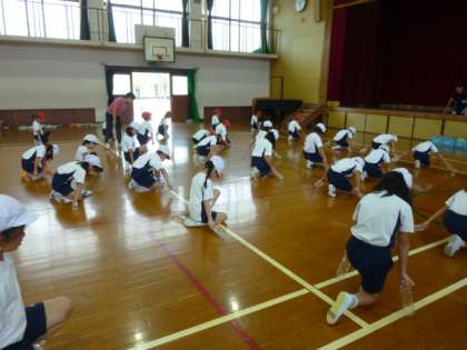 1年生と2年生が体育館でエイサーを踊っていました。空のペットボトルを両手に持ってきびきびとした動きで表現しています。楽しそうです。見ているほうも楽しくなってきます。