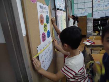 机の横の長さのテープを使って,教室のいろいろなものと長さを比べました。