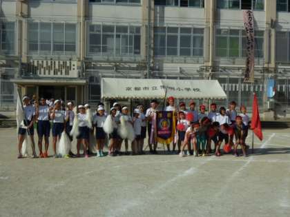 1日中大きな声で応援をして盛り上げた応援団。5年と6年の中に、3年4人、4年8人が一緒に加わりました。午後からの応援合戦では、地域の方、育友会長さんや教職員で頑張りの様子をみました。赤組「スーパーエネルギッシュ賞」白組「スペシャルチームワーク賞」となりました。日焼けした顔が、力強く、大きな声がずうっと出ていました。すごかったです。