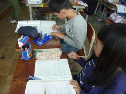 4年生の授業を見に行きました。ノートの文字がとてもきれいでした。「姿勢もいいね。」と言うとより張りきっていました。自分が見やすいノートは、1時間の学習の流れがよくわかります。その時間のめあてやまとめ、そしてふりかえりと流れに沿って書き込んでいると思います。もちろん下敷きを使って。一度どんなふうに書いているのかノートを開いて話題にしてみてください。