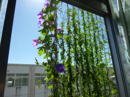 教室から見る緑のカーテンいかがですか?まだ花を咲かせています。10月ですが、きれいです。