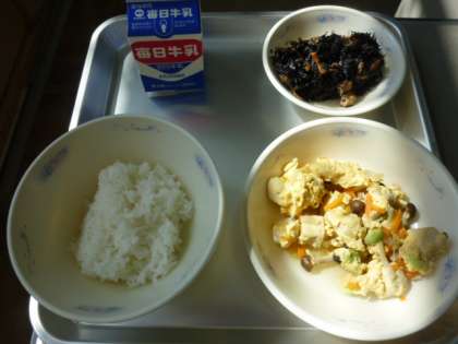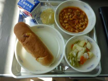 10月6日の給食は、ご飯・牛乳・ひじきのにつけ・高野豆腐の卵とじでした。高野豆腐は、和歌山県の高野山で作られたことから、「高野豆腐」と呼ばれています。10月7日の給食は、チーズコッペパン・牛乳・りんご・野菜のホットマリネ・大豆と鶏肉のトマト煮でした。りんごには、ビタミンや食物繊維がたくさん含まれています。日本一の収穫は、青森県です。ごちそうさまでした。ふわふわのチーズコッペパンでした。