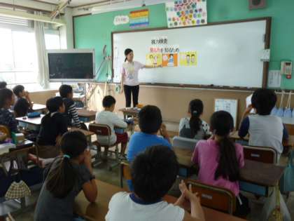 将来の養護教諭のための教育実習生が来ています。4回生です。今月は、視力検査があるので「正しい視力を測るために・・・」ということで全クラスで短い時間ですが授業をしています。10月16日が最終です。がんばっています。