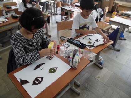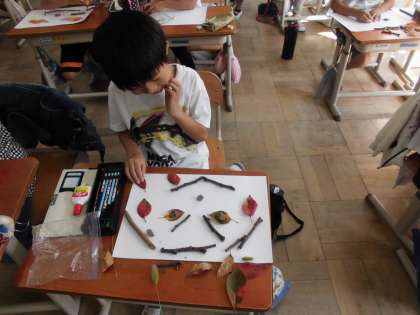校庭に落ちている落ち葉や枝や実を集めて,顔を作りました。