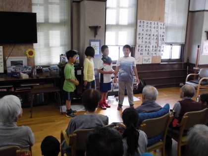 いろいろな出し物(クイズや音楽など)や昔あそび,プレゼントを渡しなどをしました。おじいさんおばあさんを元気に,笑顔にさせるために,グループに分かれて練習し,一生懸命発表しました。