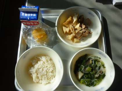 10月29日の給食は、麦ごはん・牛乳・柿・すましじる・生ぶしと厚揚げの煮つけでした。柿は一人分ずつ袋に入っていました。柿は、日本で古くから食べられている果物です。体の調子を整えるビタミンCが多く含まれています。