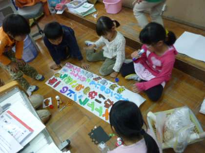1年生の教室では、学芸会の大きな「めくり」をみんなで作っていました。かわいいのが出来上がりました。お楽しみに!1年生にとっては初めての学芸会です。