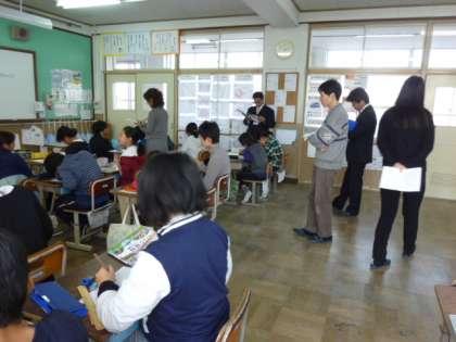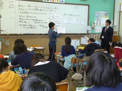 5年生の教室では、社会科で輸出について考えていました。公開授業だったので他の学校の先生にも授業を見ていただきました。地図やグラフから読み取っていました。