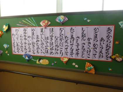 1月のあいうえお歌の掲示板を紹介します。南校舎の1階と2階の階段の間の掲示板です。ついつい、さわって確かめたくなるようなそんな掲示板です。ぜひ、ご来校ください。