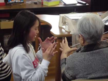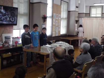 5年1組は3月3日(木)に紫明デイサービスセンターに行きました。訪ねるのは3回目なので,子ども達もしっかりと見通しをもっており,頼もしく感じました。今回の出し物は「お笑い」,「ペープサート劇」,「音楽」,「クイズ」,「パントマイム」です。前回の振り返りや反省を意識しながら計画や準備を子ども達で進めていきました。