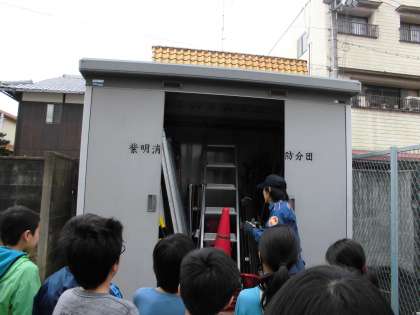 ホースから水を出すためのポンプの音に驚きながらも、学校においてある設備についても学べました。