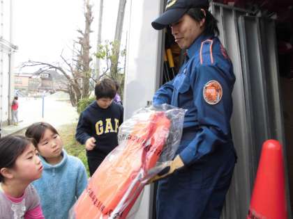 「触ってもいいよ」の言葉に,子ども達は嬉しそうに本物の消火ホースをさわっていました。