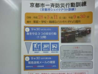 本日、京都市シェイクアウト訓練をしました。3月11日は、東日本大震災が発生した日です。震災の教訓を忘れないようにしていきましょう。子どもたちには、「まず低く」「頭を守り」「動かない」の身を守る3つの安全行動をとるように話しました。