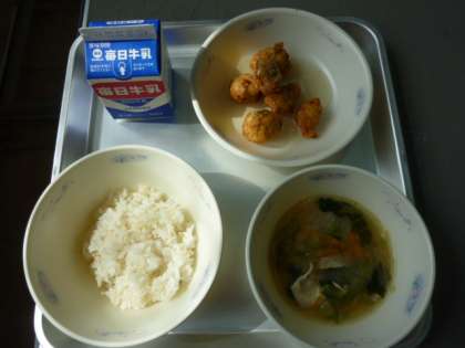 2月25日の給食は、麦ごはん・牛乳・豚汁・がんもどきのあんかけでした。がんもどきは、水切りした豆腐に鶏ひき肉、おから、にんじん、しいたけ、枝豆をよく混ぜて、丸め、油で揚げて作ってありました。おいしかったです。だしのきいた「あん」がかかっていました。