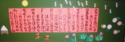 9月のあいうえお歌は2年生の担当です。「9月といえばもう秋だね!秋って運動会とかがあるけど,紫明小学校の運動会は10月だね。」「学芸会も遠足も9月じゃないよ。」「あ!給食カレンダーにお月見って書いてあったよ!」など,たくさん悩みながら,9月や秋の言葉を集めて作りました。
