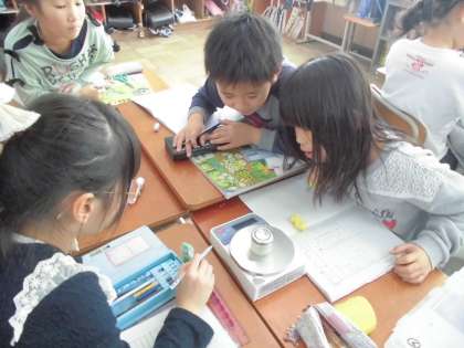 理科の学習で,デジタルはかりを使って身の回りのものの重さを調べました。算数の重さの学習で使ったはかりでは計測できなかった鉛筆のキャップやけしごむなど,様々な物の重さを調べることができました。