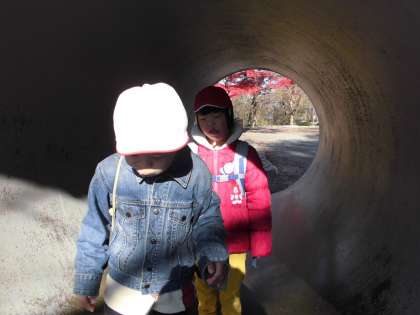 大きな導水管の中に入ったり,インクラインの線路の上を歩いたり,嬉しそうに活動していました。