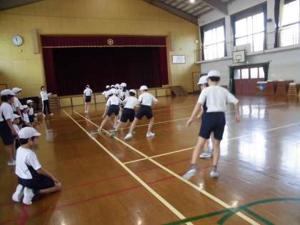 体力テストに取り組んでいます。この日は,反復横跳びををしました。反復横跳びは,前後左右に方向を変えながら素早く動く能力をを必要とする運動です。初めは慣れないステップも,練習するうちに少しずつ動きが素早くなってきました。