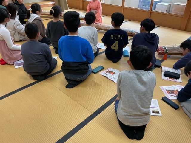音楽科の学習でお琴の体験を行いました。授業が始まる前から目を輝かせてお琴を見ていました。講師の先生にお越しいただき、実際にお琴を触ってみたり簡単な演奏をしたりしました。