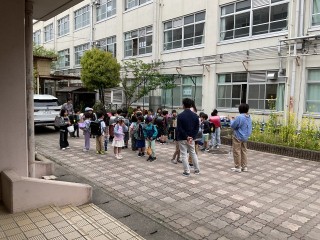 今日から1週間、1年生は同じ方向の子ども達で並んで下校します。中庭で並んで、教員と一緒に集団下校しました。これからも安全に登下校してほしいと思います。