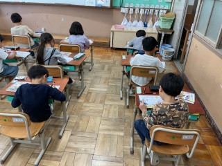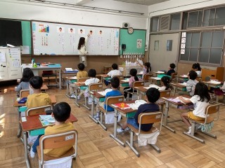 「うたにあわせて あいうえお」の文章を読んだり、ワークシートを使ってひらがなの学習をしたりしています。