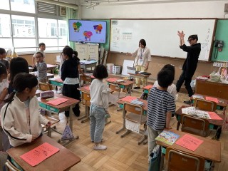 英語で自己紹介のゲームを楽しんでいます。今日はALTの先生も一緒に学習しました。