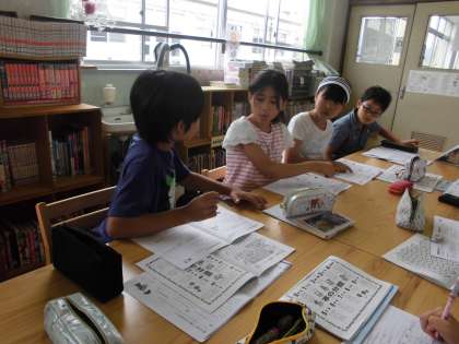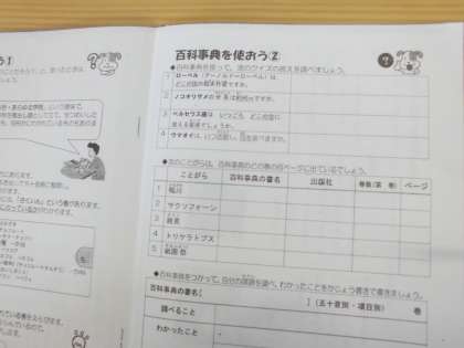 そのあとは,「『鴨川』『祇園祭』は,それぞれどの出版社の百科事典の何ページに載っているでしょう?」や「ノコギリ鮫の全長は約何mですか?」などのクイズに,二人組で協力してゲーム感覚で楽しく学習できました。