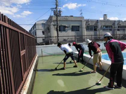 長い間使わなかったプールは,底だけではなくプールサイドもかなり汚れていました。