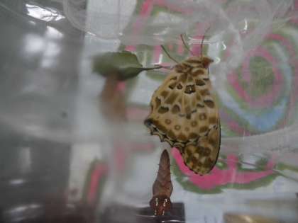 その様子を見ておられた2年生の先生が,「パンジーにつくツマグロヒョウモンチョウの幼虫を見つけたよ。」と持ってきてくださいました。子どもたちは大喜びで,毎日毎日大切にお世話をしていました。そして昨日,ついにさなぎが蝶になりました。みんなで観察し,最後は逃がしてあげました。みんなの育てている幼虫も立派な蝶になるといいですね。