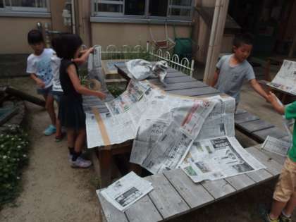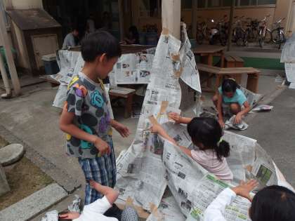 「しんぶんしとなかよし」ということで,新聞紙を切ったり折ったり破いたりしぼったりくしゃくしゃにしたり…,と様々な方法を用い,色々なものを作りました。子どもの発想と楽しみ方は,大人が思いつかないようなものばかりで素敵でした。
