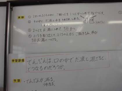 6年生が理科室で「だ液のはたらき」についての実験をしました。